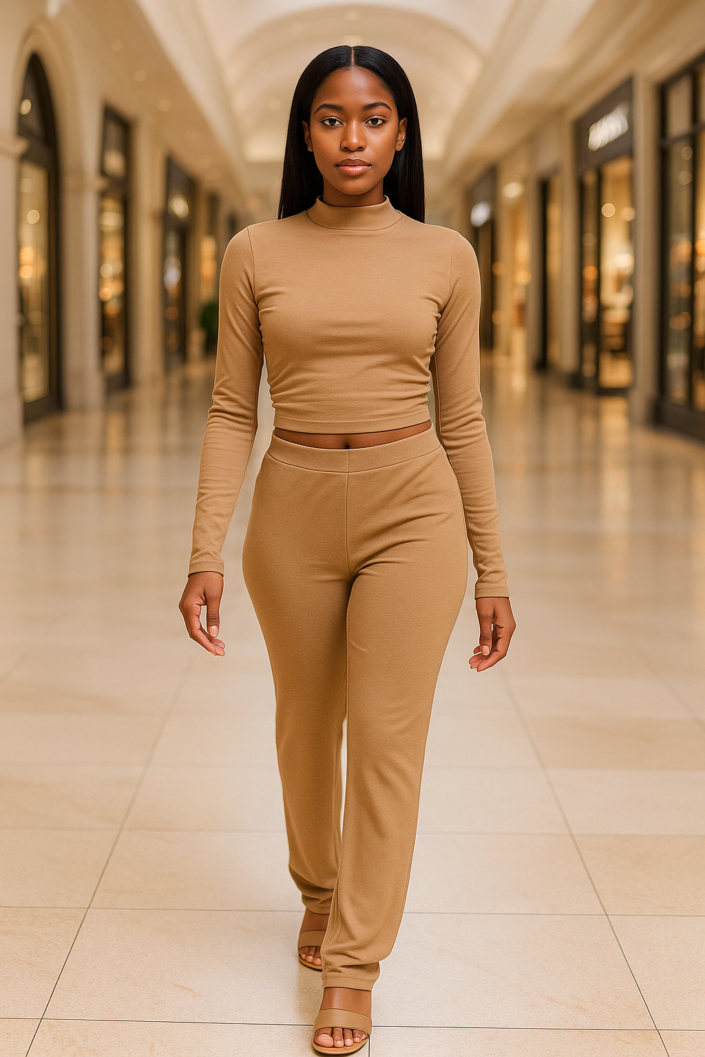Brushed Ecote Rib L/A Funel Neck Pleated Top Pants Set