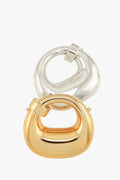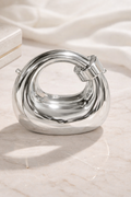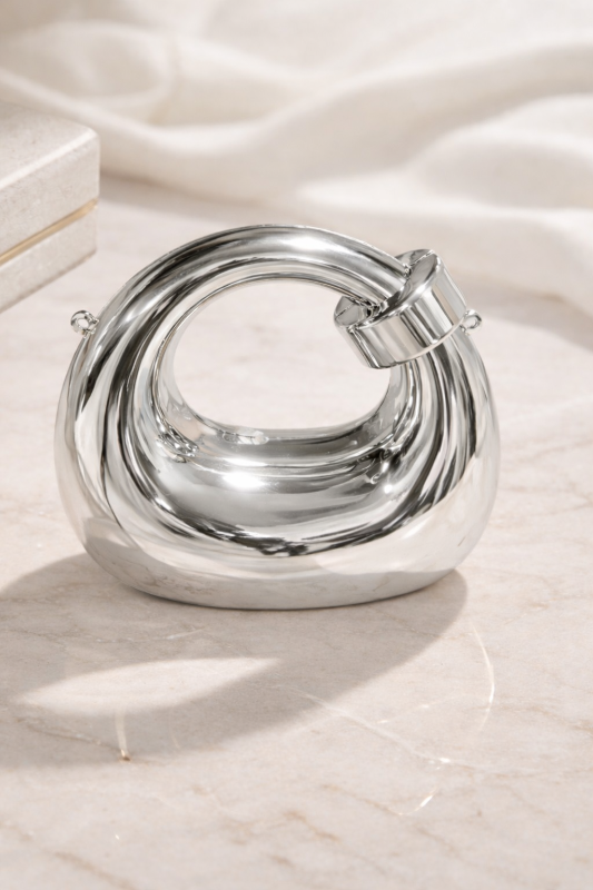 Sculptural high-shine metal clutch designed to elevate any evening look. A bold statement piece available in gold and silver.