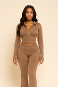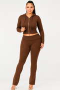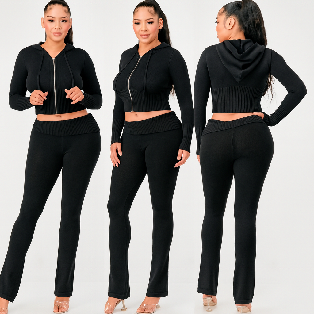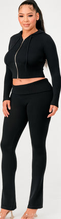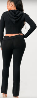 Elevate your casual look with this sleek ribbed knit two-piece set. The cropped zip-up hoodie pairs perfectly with matching high-waisted flare pants for a flattering, body-hugging fit. Designed with stretch fabric for comfort and flexibility, this set blends sporty vibes with effortless style — perfect for lounging, running errands, or a casual night out.