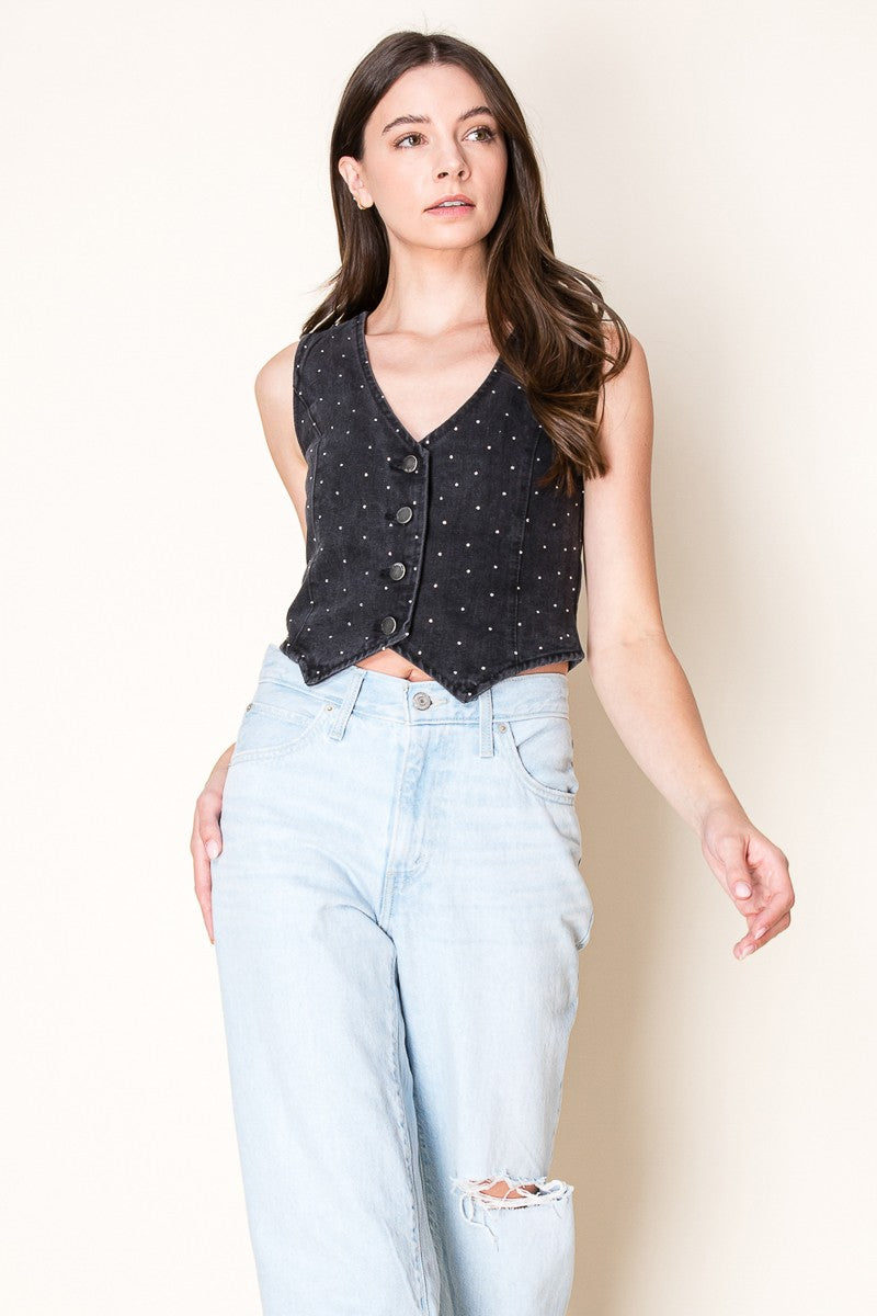 Faded Washed Denim Vest with Rhinestone