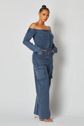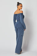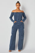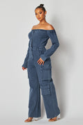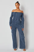 Off Shoulder Denim Cargo Jumpsuit