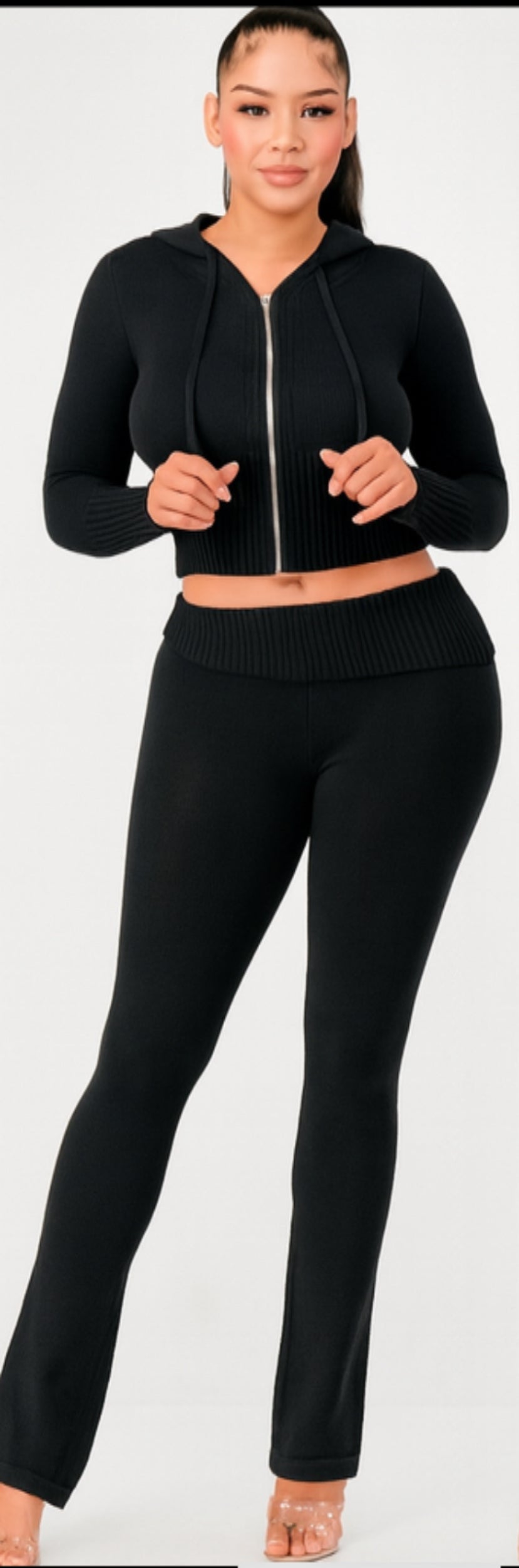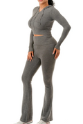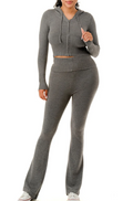 Elevate your casual look with this sleek ribbed knit two-piece set. The cropped zip-up hoodie pairs perfectly with matching high-waisted flare pants for a flattering, body-hugging fit. Designed with stretch fabric for comfort and flexibility, this set blends sporty vibes with effortless style — perfect for lounging, running errands, or a casual night out.